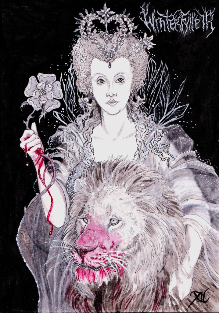 Ô Reine des fées, de contrées si lointaines ? La rose dans la main, on loue ta vertu. Un fauve d’une noblesse animale reste néanmoins à tes côtés. Derrière les songes s’écoule le sang.